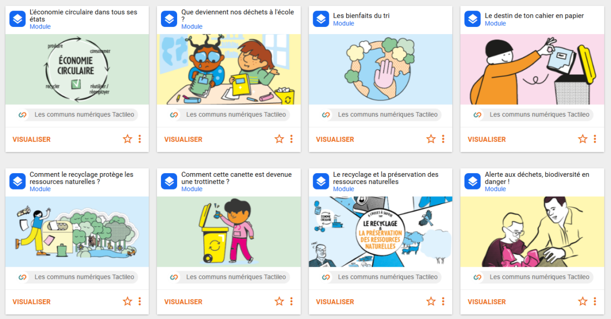 Nous enrichissons régulièrement notre offre avec de nouveaux contenus. Récemment, nous avons publié 8 nouveaux modules autour du recyclage et de l’environnement, à partir de supports pédagogiques fournis par l’éco-organisme Citeo. Nous nous sommes appuyés sur ces ressources pour proposer des parcours 100% numériques et interactifs, adaptés aux cycles 2, 3 et 4 (du CP à la 3e).